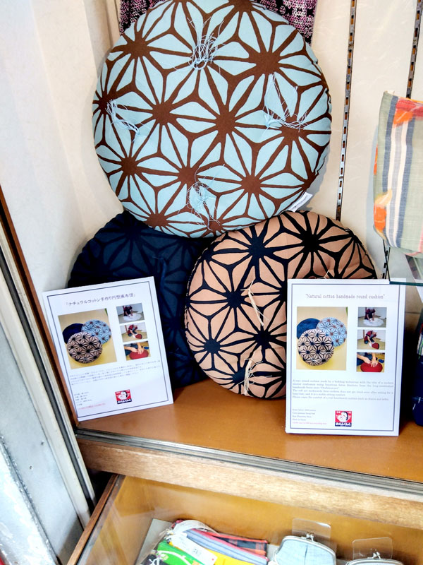 弊社でお世話になっている浅草仲見世にございます、和装小物のお店「松ヶ枝屋」に て、おたふくわたの手作り円型座布団とはんてんを展示販売いたしております。